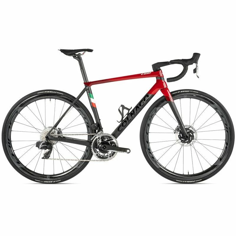 Caractéristiques techniques : – Cadre : Colnago C68 carbone UHM tubulaire (925g en taille 48) – Multi-outil intégré dans le tube de direction – Fourche : Colnago carbone UHM – Cintre : guidon monobloc carbone CC 01 – Poignées : Sram Red eTap AXS HRD – Freins : Sram Red freinage hydraulique à disque – Dérailleur arrière : Sram Red eTap avec batterie – Dérailleur avant : Sram Red eTap avec batterie – Cassette : Sram Red AXS 12 vitesses – Pédalier : Sram Red DUB 172.5 mm – Roulements jeu de direction : Ceramicspeed SLT – Roues : Fulcrum Wind 40 DB – Coloris : noir/rouge HRRD – Marque : Colnago
